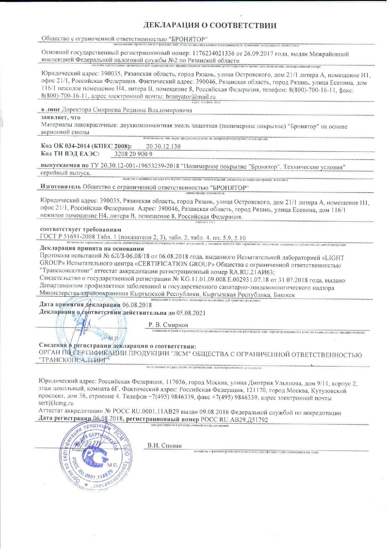 "Бронятор - защитный лак" на акриловой смоле.Применяется для окраски любых ранее окрашенных поверхностей или при комплексной окраске "ультра стойким защитным покрытием Бронятор".